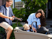 Fijn om te weten: met een Maxi-Cosi in de houder is er nog plek voor twee peuters op het zitbankje én past de regentent er gewoon overheen.