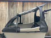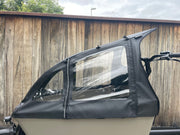 De huif is gemaakt van stevige, waterdichte stof en heeft slimme ritsen waarmee je de ramen makkelijk opent, oprolt en vastzet. Handig bij het in- en uitstappen, of als je wat extra frisse lucht wil. Bij warm weer kunnen de zijkanten en achterkant helemaal open – voor ventilatie én gezelligheid onderweg.